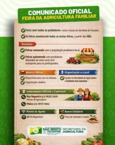A Prefeitura de São Bento do Tocantins, por meio da Secretaria Municipal de Agricultura, anunciou novas diretrizes para o funcionamento da Feira de Agricultura Familiar no município. A iniciativa tem como objetivo fortalecer a produção local e ampliar as oportunidades de comercialização para produtores rurais.